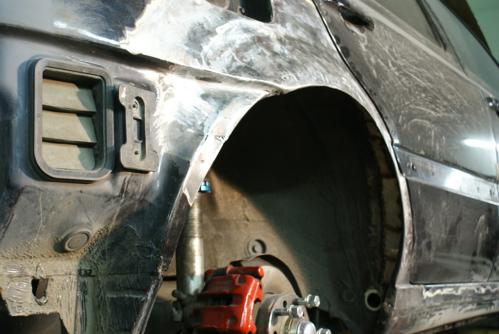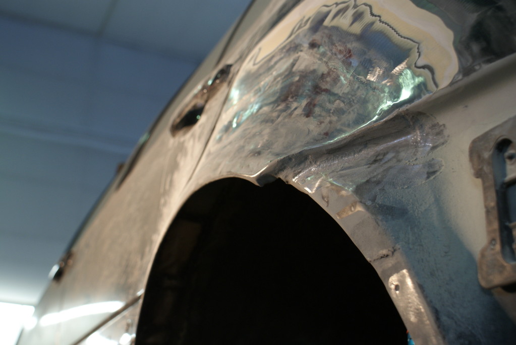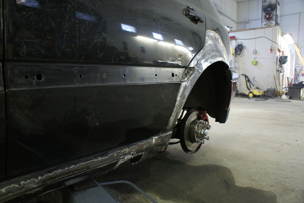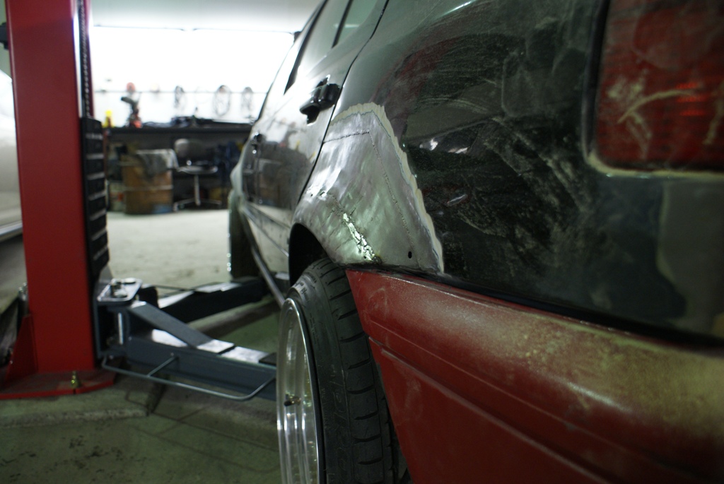 Taakse täppäilin uuden lokarin korjauspalan, vakiona todella ahdasta. Kuvio tuli reilu sentin yli kaaresta. Yksi pitkittäisviilto ja pystyviiltoja useampi, niin pääsi siihen mukavaan vaiheeseen, eli päättämään kaaren lopullisen muodon. Kaiken kaikkiaan leveyttä ei tullut kuin n. 3cm lisää verrattuna vakioon. Sisäkantista leikkasin puolet pois ja naputtelin jämäkantin sisään. Pulleutta tuli sopivasti, eli muoto on lähellä etukaarta ja kaaren ulkoreuna on etupäätä matkien renkaan kyljen puolessa välissä. Puolivammasena joutu töitä tekemään ja eteneminen sen myötä hävettävän hidasta, mutta loppuun pari kuvaa: