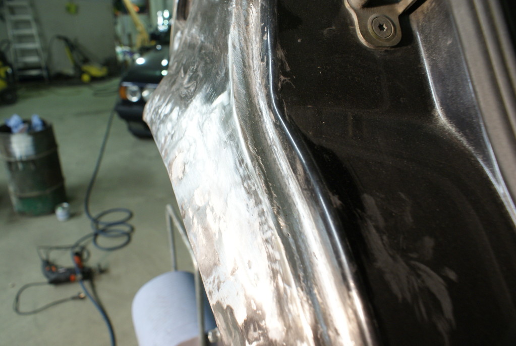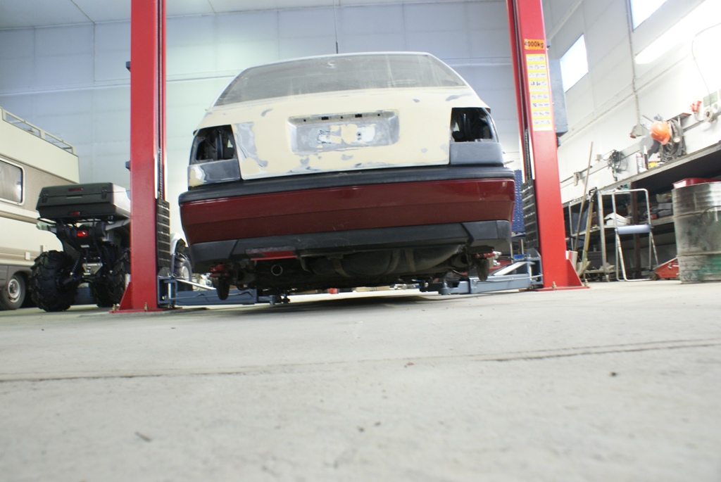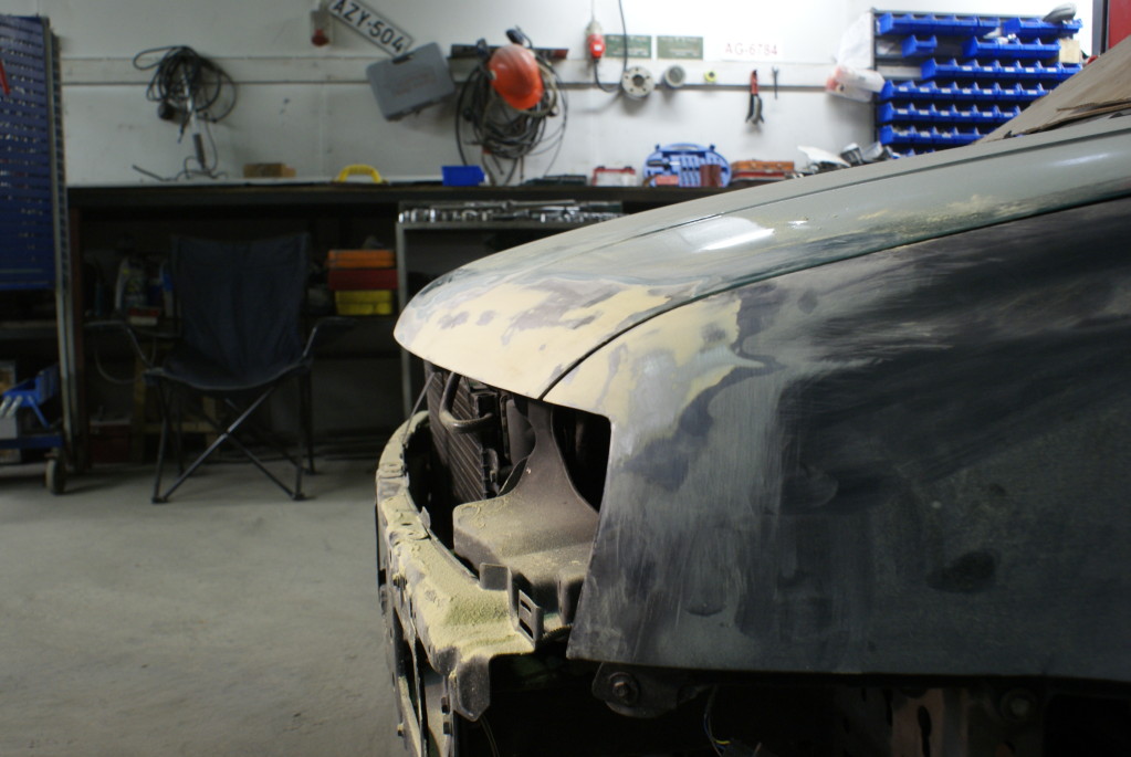 Pellin ja lokarit istutin kohdilleen, että sai viimeisteltyä konepellin lirpakkeet ja lokarien pätkät muotoonsa, sekä tinat sulateltu. Takaloksut myös tinattu ja sisäloksut vetäisin ensin harjalaikalla puhtaaksi, puhdistus ja ruosteenestomaali selkään, sen kuivuttua tiivistysmassaa. Odotellaan että se kuivuu niin kivenisku perään. Kotelosuoja-aineet myös tungettu helmakoteiloihin ja sisäloksujen sisäpuolelle. Nytpä alkaa sitten se kittaa-hio-työvaihe. Takavaloiksi tullee nuo verkun omat tuikut.