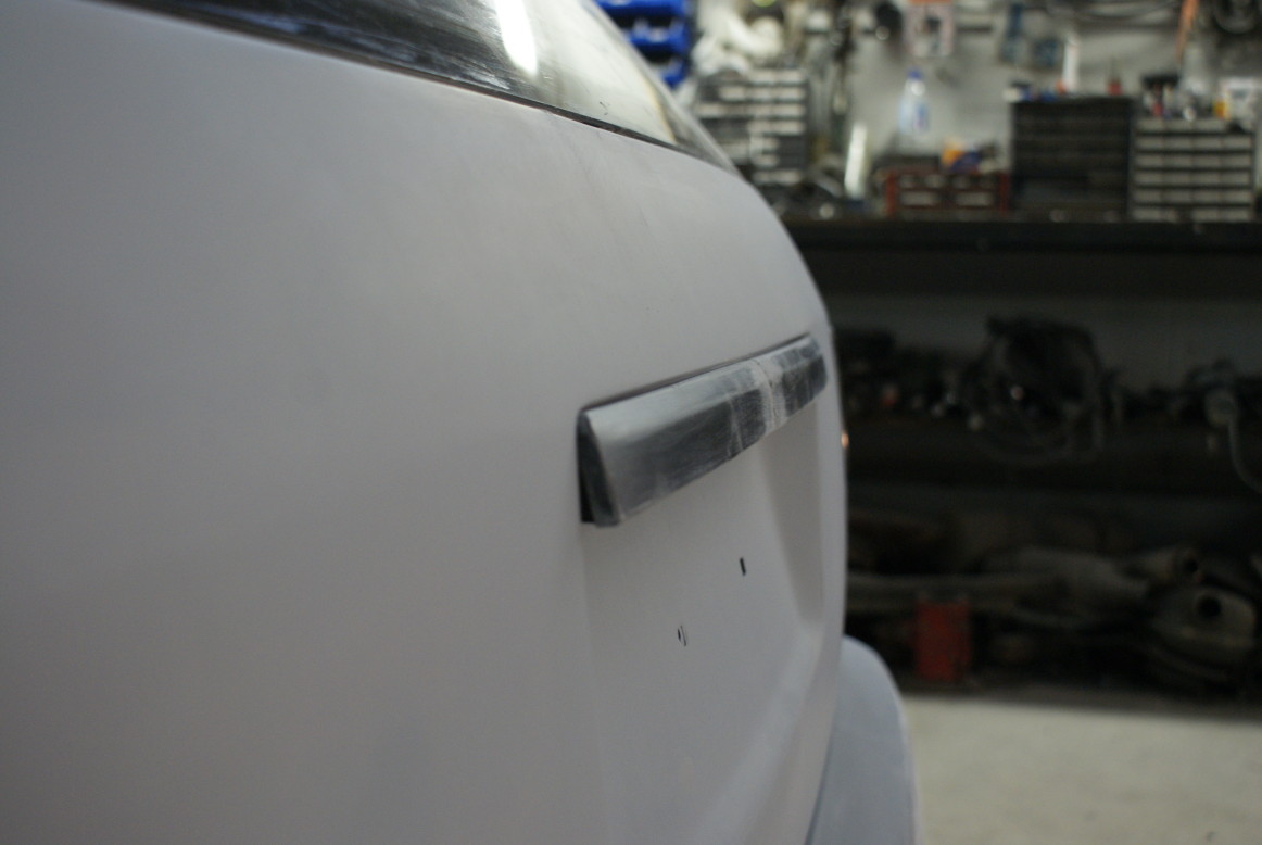 Molemmilla puolilla on takaloksut pintapuolisesti valmiit, helmapellit vaihdettu ei-niin-ruosteisiin. Takapuskurista päädyt rupesi istumaan leveimpiin lokareihin lämmittämällä, puskurista häviää myös pakoputken lovi ja uusi paikka putkelle löytyi kuskin puolen helmasta, valmiista homemade-putken päästä ei näy kun pääty ja pääty tullaan muotoilemaan mukailemaan helman muotoa. Early maskista tehdään merkitön. Loppuun muutamia kuvia: