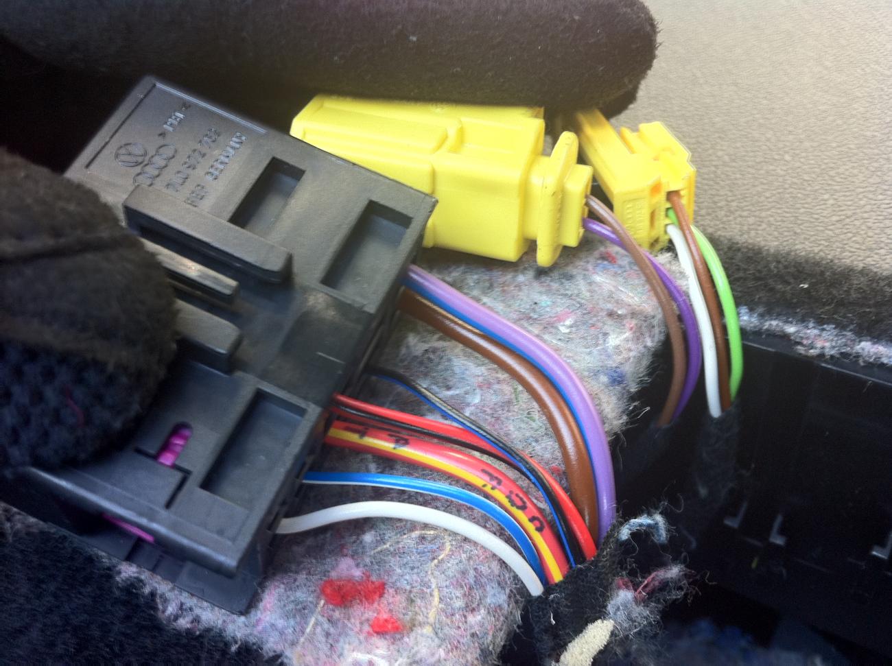 Penkin alla olevassa isossa mustassa liittimessä (jossa violetit sisuskalut) menee siis sähköt koko penkin toiminnoille (lämmitys, sähkösäädöt, jne.). Tähän liittimeen tulee penkin puolelta puna/keltainen johto (päävirta) ja puna/musta johto (ristiseläntuen säätö). Johdot ovat liittimessä rinnakkain: Kuva (varastettu muualta, liitinkin on "väärän puoleinen" eli auton puoleinen liitin? Mutta värit täsmäävät. Tuo kolmas liitin on täysin erilainen kuin mulla...).